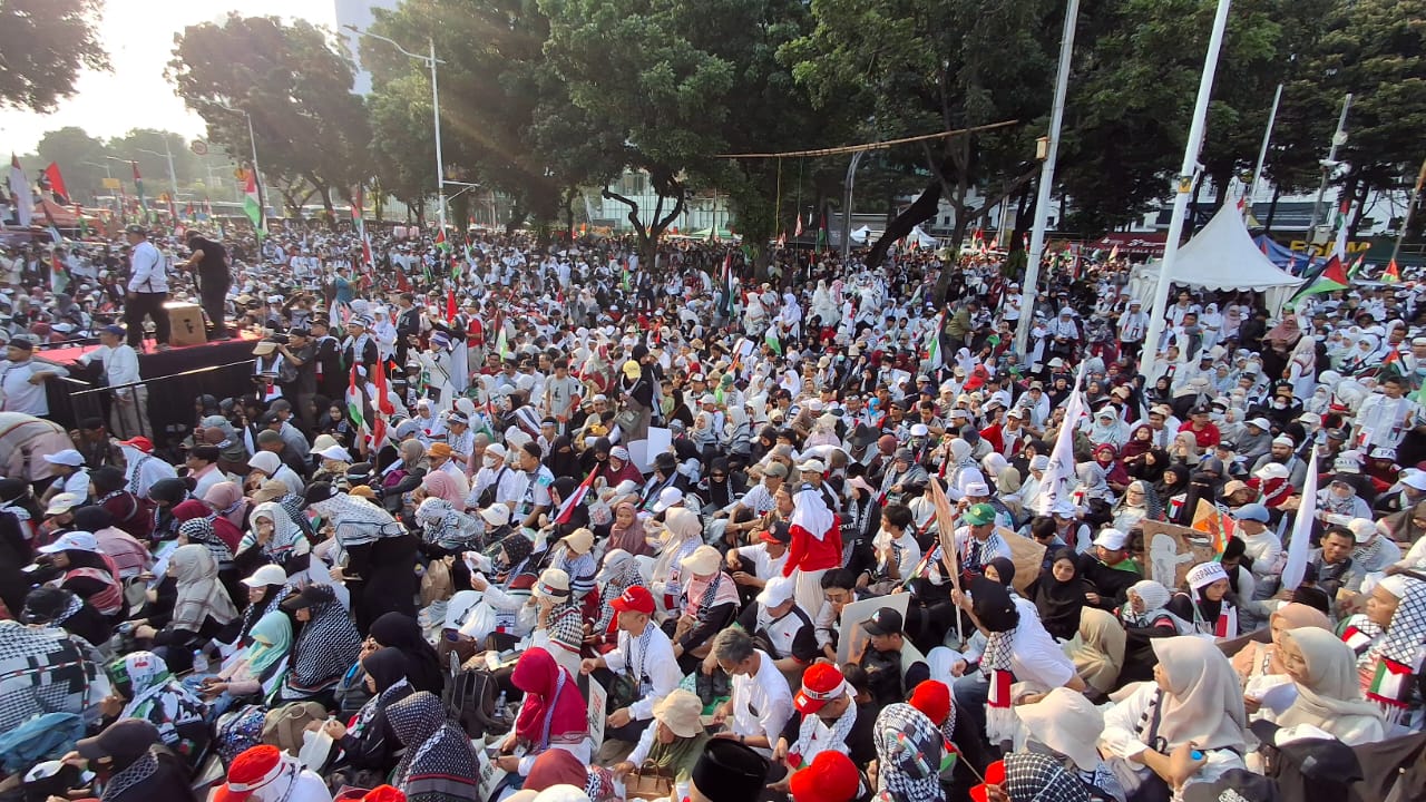 Jakarta – Ribuan warga mengikuti aksi bela Palestina bertajuk “Indonesia Melawan Genosida” yang digelar di kawasan Patung Kuda, Jakarta Pusat pada Minggu.